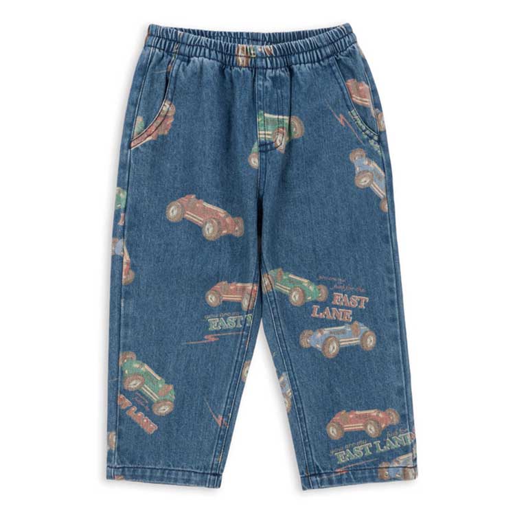Pantalón denim con estampado de coches. Bolsillos y goma en cintura. Tejido blandito y cómodo.