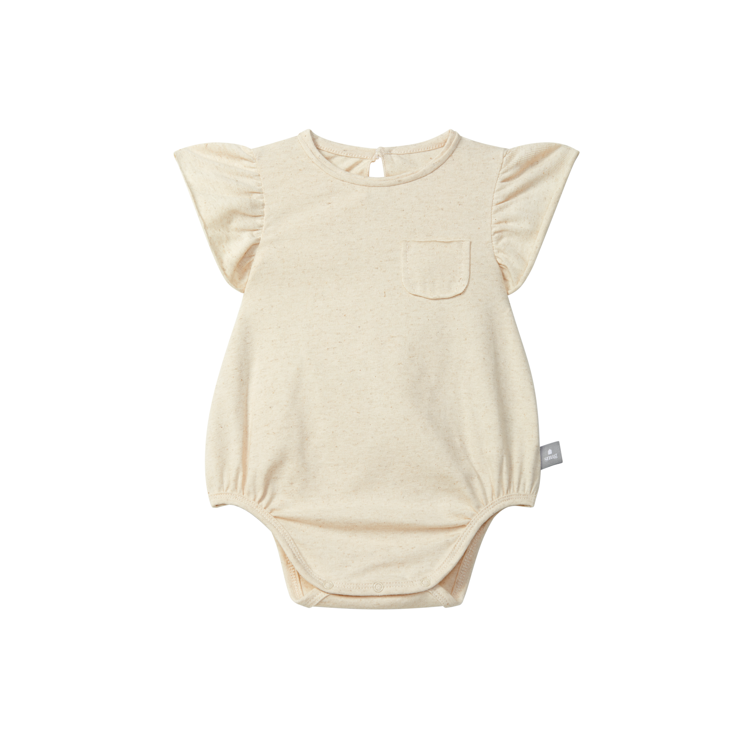 Body bebé de lino y con volantes. Abertura en forma de lágrima en la espalda. Cuello redondo y manga corta. Bolsillo frontal decorativo. Zona pañal con botones snap.