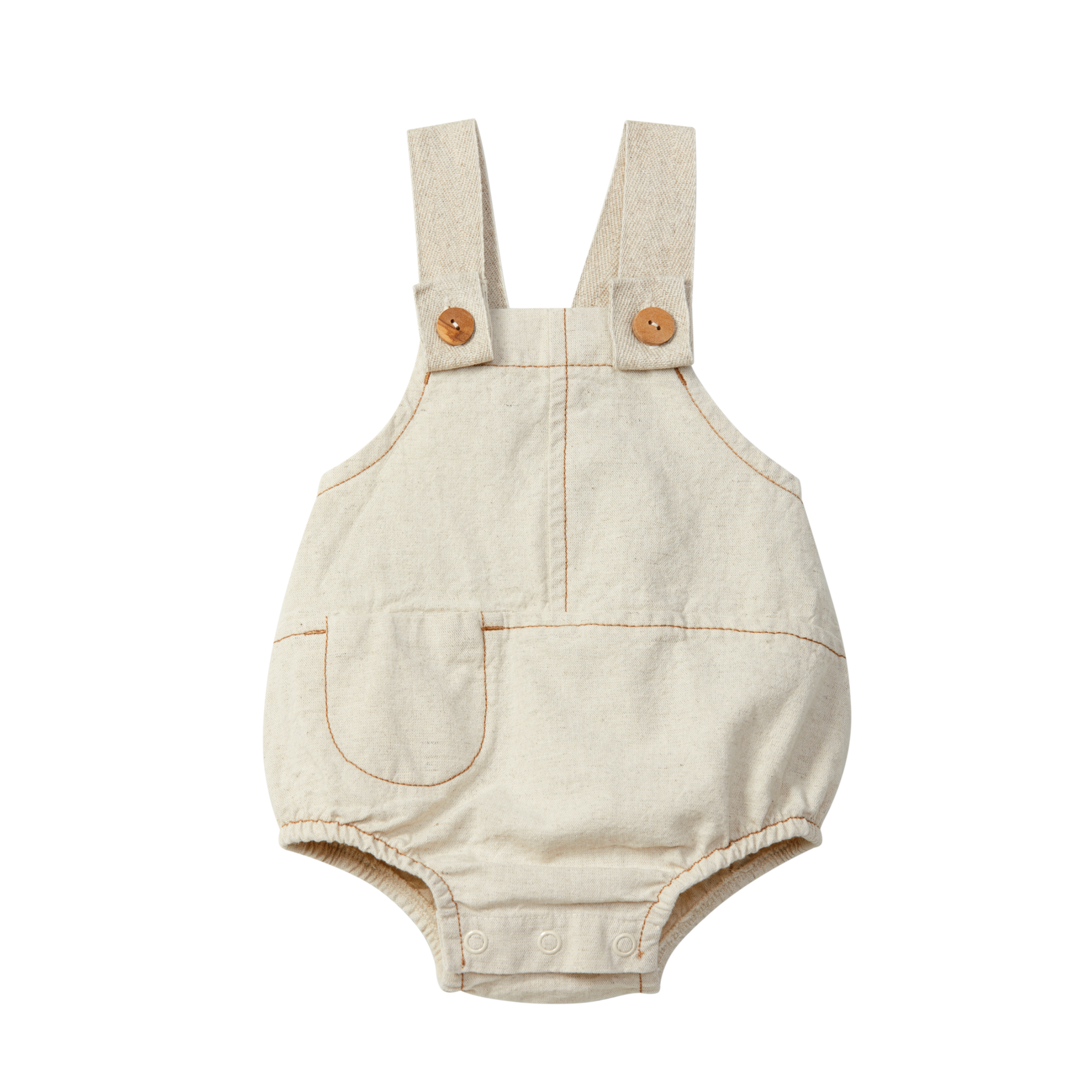 Peto bebé corto de lona con un toque de lino. Estilo orgánico con pespuntes en contraste y práctico bolsillo frontal. Se abrocha con botones de madera en los tirantes en dos posiciones y broches de presión entre las piernas.