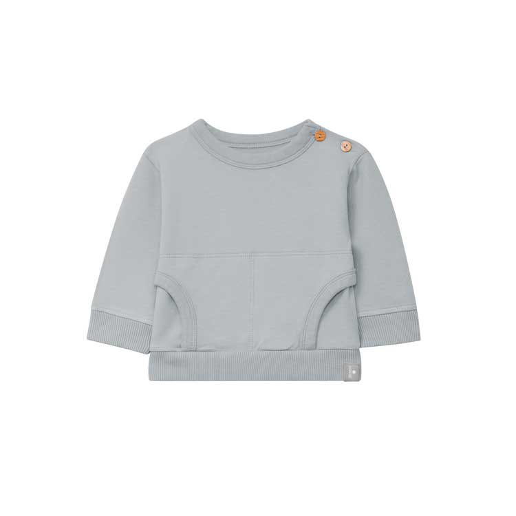 Sudadera bebé color azul grisáceo. Apertura en hombro con botones de madera. Bolsillos frontales. Canalé en cuello, bocamanga y bajo.